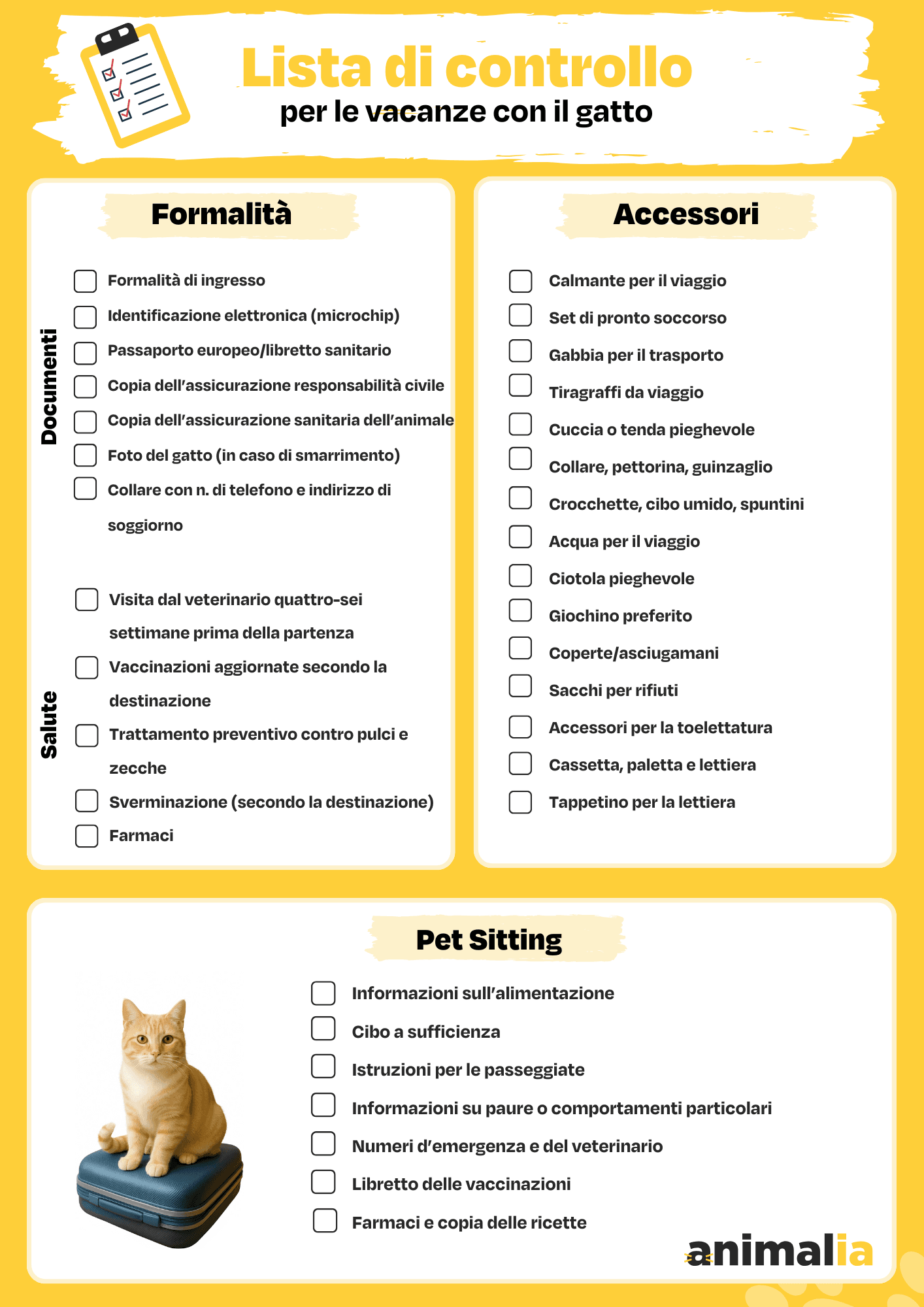 Buono a sapersi: oltre all’RC, è consigliabile stipulare un’assicurazione sanitaria per il vostro gatto in modo da anticipare eventuali spese veterinarie durante le vacanze. Scoprite le soluzioni Animalia sul nostro sito.